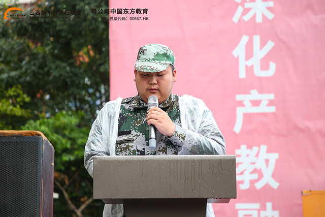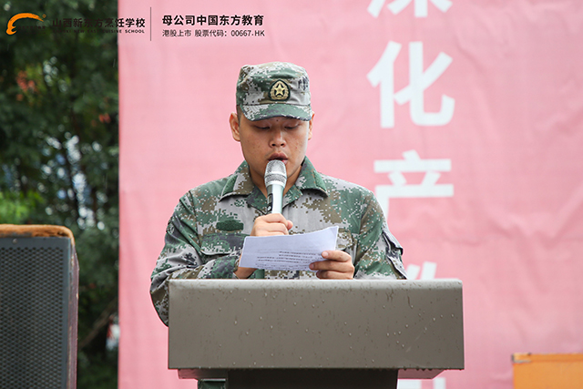 廖主任暖心寄語新生,“軍訓(xùn)是大家入校后面對(duì)的一次重要考驗(yàn),是開啟職校階段學(xué)習(xí)的重要一課,也是大家接受國防教育、組織紀(jì)律和艱苦挫折教育的基本形式。希望同學(xué)們?cè)诒敬诬娪?xùn)中要有所啟迪,提高政治思想覺悟,加強(qiáng)‘愛我中華’和‘強(qiáng)我國防’的使命感;同學(xué)們還要不斷學(xué)習(xí),掌握一定的軍事知識(shí)和技能,為祖國的繁榮昌盛和強(qiáng)大而學(xué)習(xí);同學(xué)們更要形成高尚的作風(fēng)和道德情操,鍛煉自身體魄,增強(qiáng)集體主義精神和紀(jì)律觀念,提高自身綜合素質(zhì),展現(xiàn)山西新東方學(xué)子應(yīng)有的精神風(fēng)貌”。