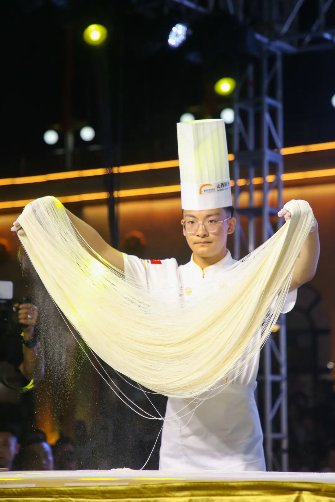 在這方小小的操作臺(tái)上,面條仿佛被賦予了生命,只見面條在學(xué)員的手上,上下晃蕩,左右打花,直至面團(tuán)充分融合。然后抻開,卷起,再抻開,再卷起。隨著一次次的抻拉與卷起,面條逐漸變得細(xì)長柔韌,宛如山間清泉,潺潺流淌,最終匯聚成一股不可阻擋的力量,象征著中華民族堅(jiān)韌不拔、源遠(yuǎn)流長的精神。當(dāng)這碗承載著無數(shù)匠心與情感的長壽面最終呈現(xiàn)在眾人面前時(shí),它不僅是一碗面,更是一曲對(duì)生命、對(duì)家國深情的頌歌。