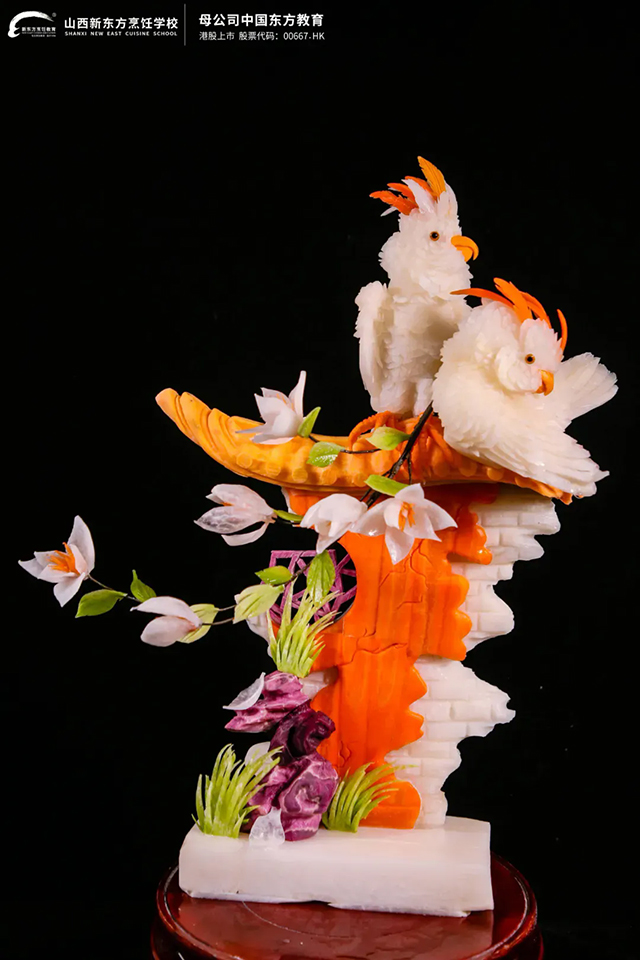 “心中有愛,刀下有形”,操場上,學(xué)員們聚精會(huì)神,成竹在胸。他們的手,有千鈞之力;他們的眼,有秋毫之察。時(shí)而輕描淡寫,時(shí)而勾勒線條,每一刀都恰到好處。學(xué)員們憑借著扎實(shí)的技藝,對(duì)果蔬雕刻藝術(shù)的用心傳承,以及對(duì)祖國的拳拳之心,讓平凡的食材展現(xiàn)出質(zhì)樸而原始的生機(jī)盎然。在雕琢中歷練,以匠心向祖國表白。踏浪的麒麟、沖天的飛龍、展翅的雄鷹,以及羽毛華麗的孔雀,這些令人目不暇接的美麗雕刻圖案,宛如藝術(shù)品的級(jí)別。新東方學(xué)子用自己熱愛的方式,雕刻出祖國的美好風(fēng)光,也讓世人見識(shí)到了中國式浪漫和中國果蔬雕刻的精美絕倫。