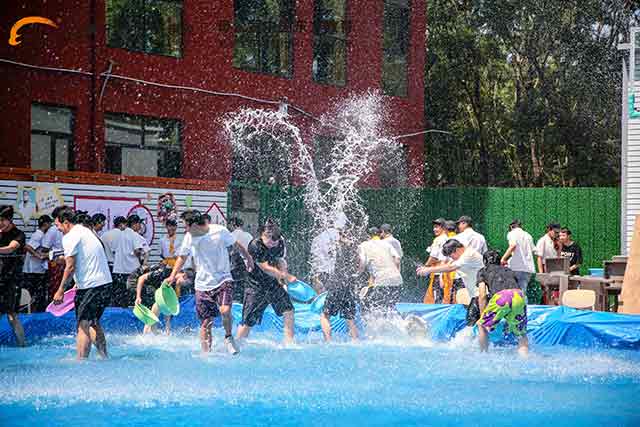 潑水聲、歡呼聲、音樂(lè)聲交織成夏日最動(dòng)人的樂(lè)章。同學(xué)們手持水槍、水盆,在劃定的活動(dòng)區(qū)域里盡情“開(kāi)戰(zhàn)”。平日里在實(shí)訓(xùn)車間專注于刀工火候的烹飪專業(yè)學(xué)生,此刻化身“水戰(zhàn)高手”,靈活躲閃間不忘精準(zhǔn)“反擊”;在美容美發(fā)實(shí)訓(xùn)室里細(xì)致練習(xí)造型的同學(xué),則用創(chuàng)意十足的“濕發(fā)造型”為這場(chǎng)狂歡增添了幾分時(shí)尚感。老師們也放下了課堂上的嚴(yán)肅,加入戰(zhàn)局與學(xué)生們打成一片,水珠順著笑容滑落,模糊了師生間的距離,只剩下并肩作戰(zhàn)的暢快。